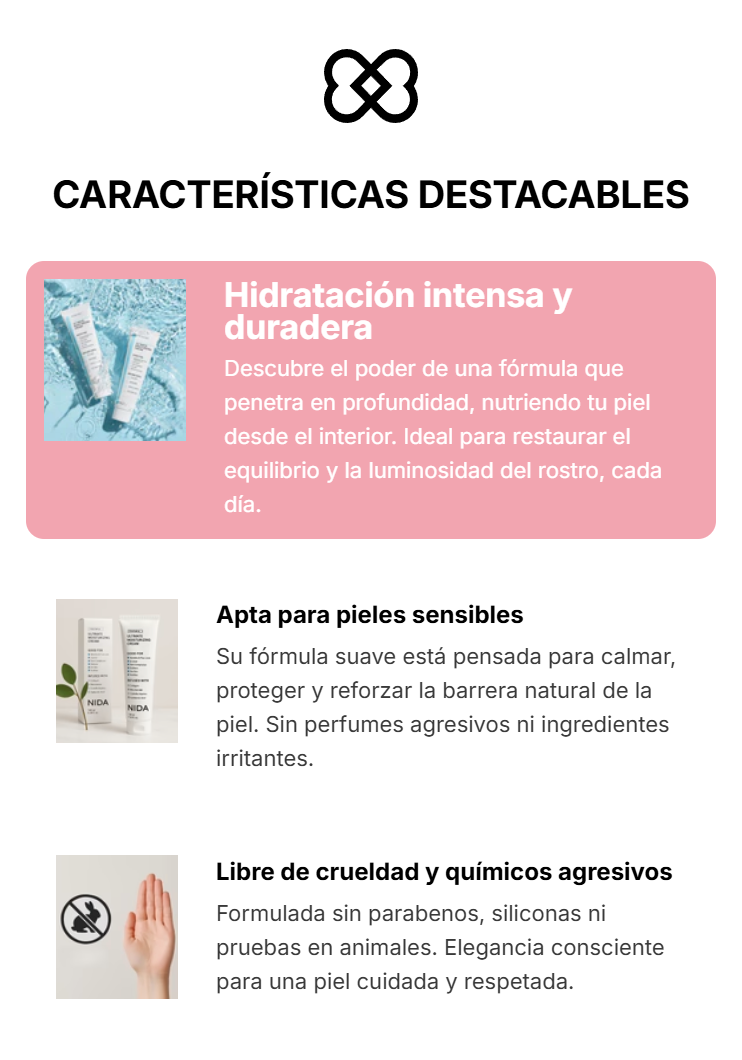 Nuestra crema NIDA combina hidratación intensa, cuidado avanzado y una fórmula de alta gama que mima y protege tu piel. Perfecta para el uso diario, transforma tu rostro desde la primera aplicación, aportando suavidad, frescura y una sensación de bienestar absoluto.