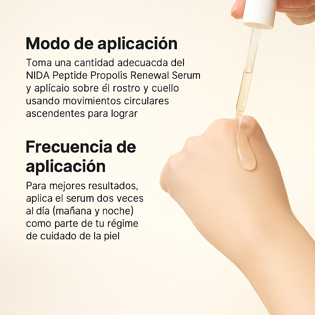 Sérum Nida – Renueva es un tratamiento intensivo formulado con propóleo, péptidos y adenosina, tres activos poderosos que trabajan en sinergia para regenerar, reafirmar y revitalizar la piel. Ideal para combatir la flacidez, las arrugas y el tono apagado. Sentirás tu rostro más firme, suave y luminoso desde las primeras aplicaciones.